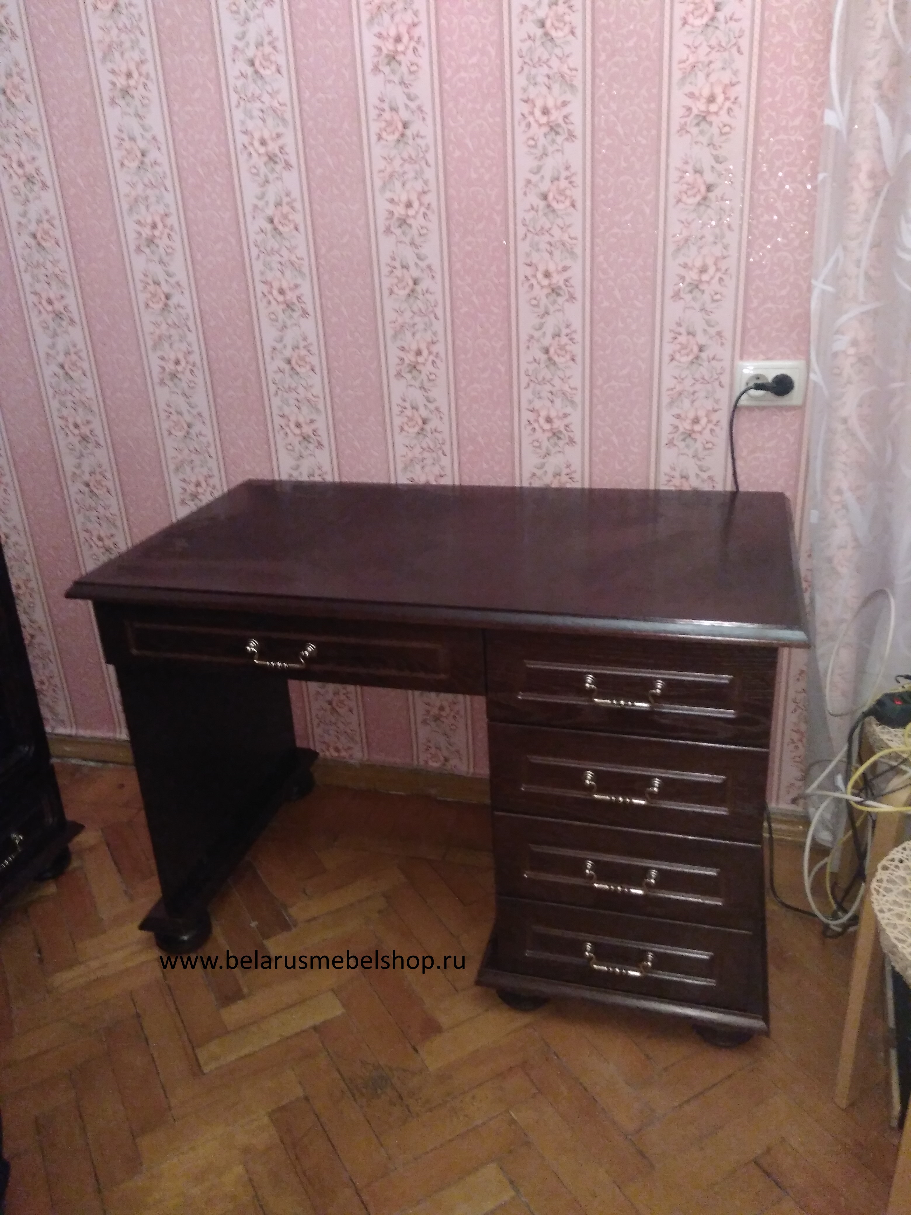 Компактный письменный стол отлично подойдёт для комнаты небольших размеров.Очень похож на стол "Денвер-3",только в отличии от него не имеет выдвижной приставки ( вместо неё широкий ящик) и вместо отделения с дверцей имеет три выдвижных ящика,так же изготавливается в крашениях : "орех темный","медовый дуб","натуральный дуб","белая эмаль" и "эмаль золотая".