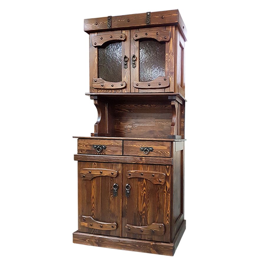 Буфет "Русич" из массива сосны с элементами ковки имеет 1-у открытую полку, 2-а выдвижных ящика и 2-а ящика с дверками (верхний и нижний), разделенные внутри полкой на две части..Материал : 100% массив сосны. Цвет имеет небольшой блекс . Покрытие приятное с шелковистостью.ВОЗМОЖНО ИЗГОТОВЛЕНИЕ ПО ИНДИВИДУАЛЬНЫМ РАЗМЕРАМ.