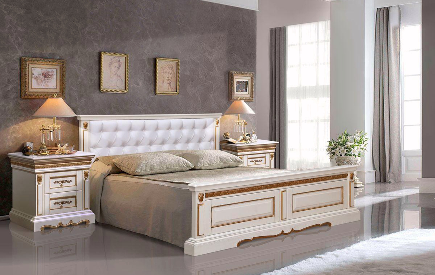 Кровать двуспальная "Милана" слоновая кость с золочением(мягкое изголовье)