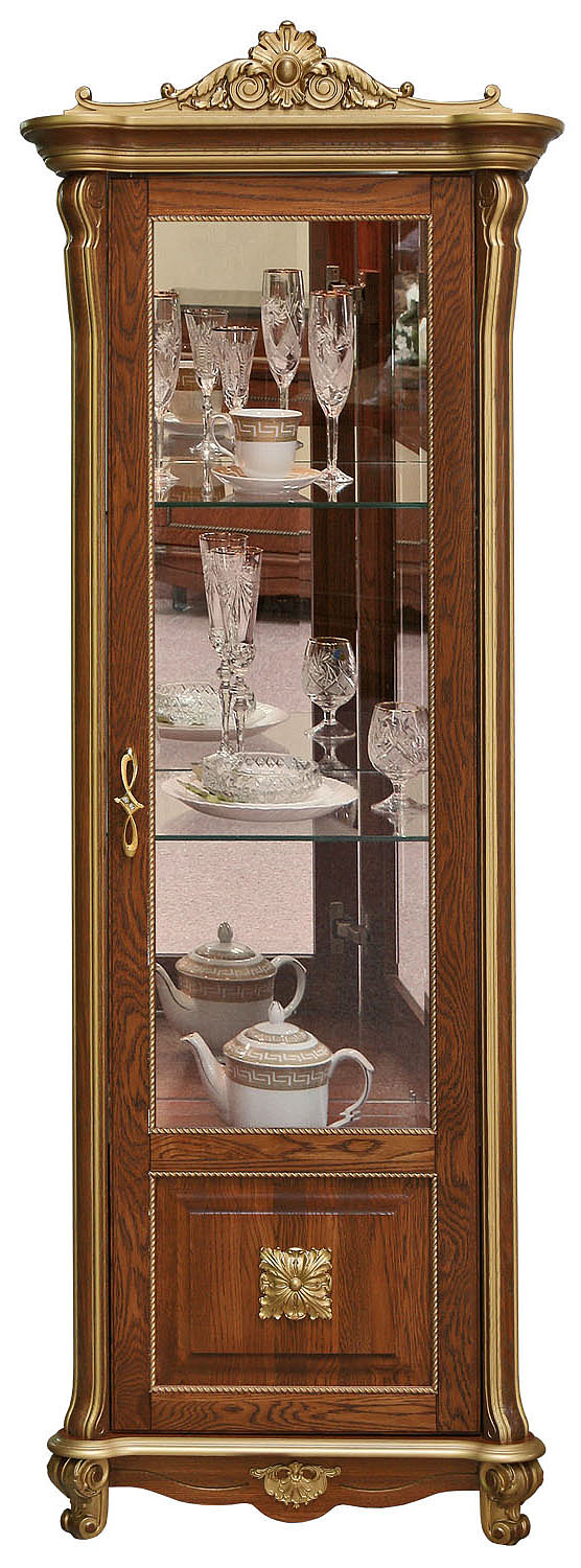 Фасад витрины выполнен из массива дуба в рамочно-филёнчатой конструкции, где филёнкой служит стекло с фацетной обработкой. Каркас изготовлен из МДФ и ДСтП, облицованных натуральным шпоном дуба, — такое сочетание обеспечивает прочность и стабильность конструкции, сохраняя при этом выразительную текстуру древесины. Золочёные накладные элементы из так называемой «древесной пасты» добавляют фасаду рельефность и нарядность. Высококачественное лаковое покрытие защищает поверхность от влаги и повседневного износа. Фурнитура — от европейских производителей Hettich, GTV и Gamet — работает плавно и надёжно.