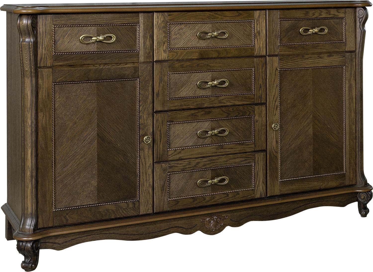 Длина (мм) 1569 мм; Ширина (мм) 501 мм; Высота (мм) 946 мм; Вес : 113,5 кг; Объем : 0,848 м3; Фасад : натуральный массив дуба; Каркас : облицованная натуральным шпоном МДФ и ДСтП; Комплектация : с выдвижными ящиками; с ножками; с полками;