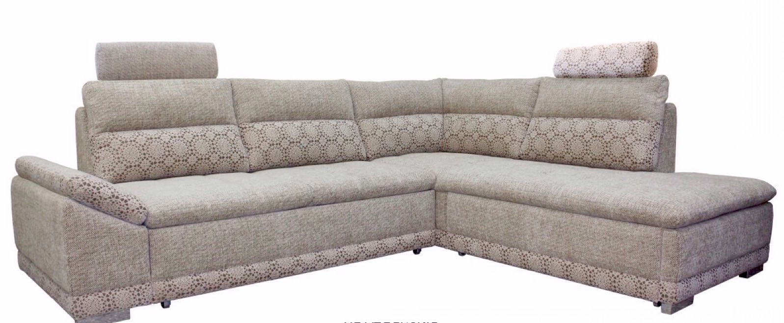 Каркас : используются брусковые заготовки из цельной древесины бука, березы и сосны, а так же древесные плиты; Сиденье и спинка : «слоеный пирог» из нескольких марок ППУ. Односторонние мягкие беспружинные элементы. Детали мягких элементов представляют собой «слоеный пирог» из нескольких марок ППУ, в том числе высокоэластичный ППУ марки 3038 на эластичном основании на основе гнутоклееных фанерных планок; Спинка : выполняется на основе наполнителя «Софт плюс» в дополнительных чехлах из спанбонда; Боковина : коробчатой конструкции мягкими несъемными подлокотниками, выполненными из ППУ; Особенности изделия: Опоры : из полимерного материала, хромированные; Наличие у изделия выдвижного ящика для постельных принадлежностей (под сиденьем оттоманки модуля 5AL(R) или короба для белья в модуле 6ML(R) под оттоманкой; Наличие двух съемных подголовников, обеспечивающих максимальный комфорт при сидении; Мягкие элементы сидений выполнены пиковкой втяжками; Диван-кровать установлен на декоративных хромированных опорах; Боковины : съемные. Данная модель комбинируется в 2 тканях или в комби-варианте (115 группа без контрастных вставок);